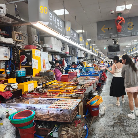 제 친구가 부산에 있는 동안 유명한 수산시장을 경험하고 싶어 했는데, 사실 저는 해산물을 먹지 않지만, 그래도 친구의 도움을 받기 위해 따라갔어요.
