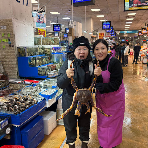 127번 매대에는 친절한 아주머니(중국어 가능)가 계시고, 2층에는 요리도 도와줄 수 있는 식당도 있습니다(직원 중 일부는 중국어도 가능합니다). 작은 왕게 한 마리 + 굴 3개 + 새우, 조개 등 세트는 19만 5천 원입니다. 케이터링 서비스는 6만 3천 원(볶음밥, 맥주, 조개 껍질 제거 포함)입니다.