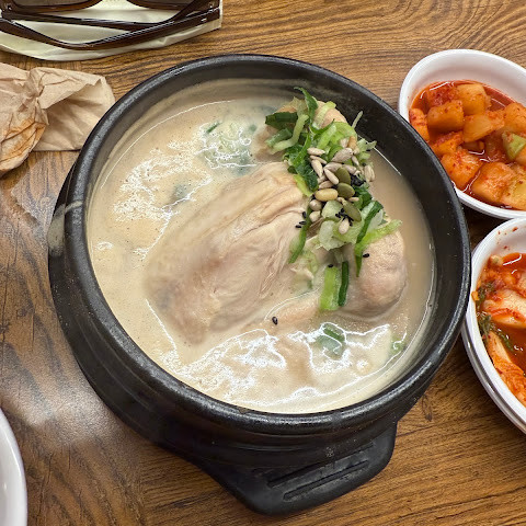 남편과 함께 유명한 삼계탕을 먹으러 왔습니다. 전반적으로 맛은 훌륭했고, 특히 인삼 향이 진하게 느껴졌습니다. 여러 곳에서 삼계탕을 먹어봤지만, 어떤 곳은 인삼 향이 이렇게 강하게 느껴지지 않았거든요. 겨울에 먹기 딱 좋은 곳입니다. 한국의 여름은 매우 덥고 탈수 증상이 심할 수 있기 때문에, 현지인들은 여름에도 체력 보충을 위해 삼계탕을 즐겨 먹는다고 합니다.