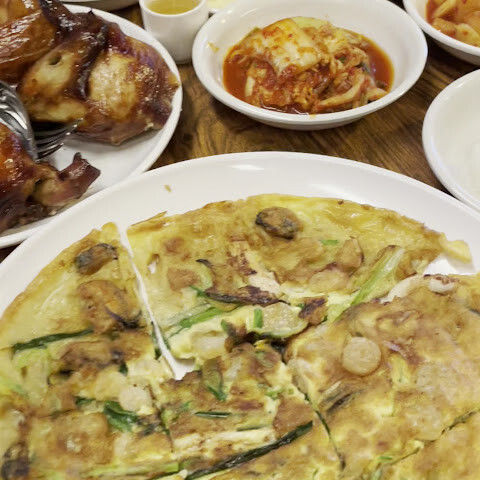 저는 인삼 맛을 별로 안 좋아하는데, 여기 인삼닭은 정말 맛있었어요. 구운 닭고기는 그냥 그랬고요. 해물파전은 해산물 맛이 진하게 났어요. 가격은 좀 비쌌지만 그만한 가치는 있었어요. 입구에 있던 남자는 불친절하고 태도가 안 좋았지만, 자리를 안내해 준 예쁜 여직원은 아주 친절했어요. 각 테이블에 생수병이 놓여 있는 것도 세심한 배려였어요. 모두에게 제공된 인삼주는 좀 특이했어요. 실내는 좀 답답했어요.