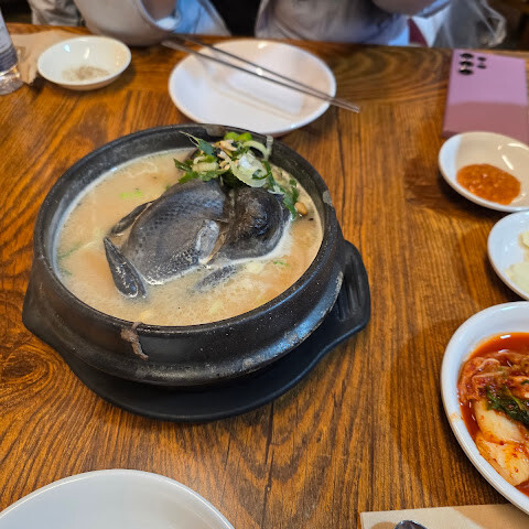 남편과 함께 유명한 삼계탕을 먹으러 왔습니다. 전반적으로 맛은 훌륭했고, 특히 인삼 향이 진하게 느껴졌습니다. 여러 곳에서 삼계탕을 먹어봤지만, 어떤 곳은 인삼 향이 이렇게 강하게 느껴지지 않았거든요. 겨울에 먹기 딱 좋은 곳입니다. 한국의 여름은 매우 덥고 탈수 증상이 심할 수 있기 때문에, 현지인들은 여름에도 체력 보충을 위해 삼계탕을 즐겨 먹는다고 합니다.