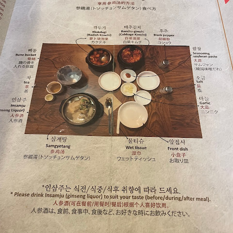 유명한 인삼국기집이라 그런지 메뉴가 중국어, 영어, 일본어로 제공되어 관광객들이 주문하기에 아주 편리했어요. 국물을 어떻게 먹어야 하는지에 대한 설명도 센스 있게 적어 놓았더라고요.