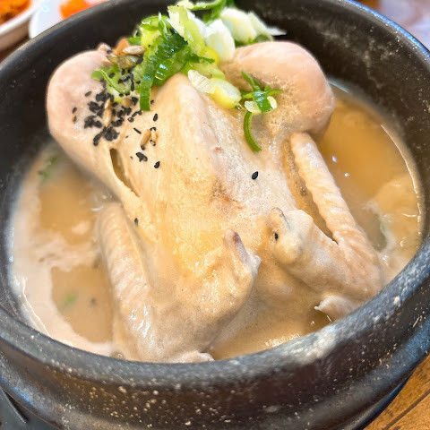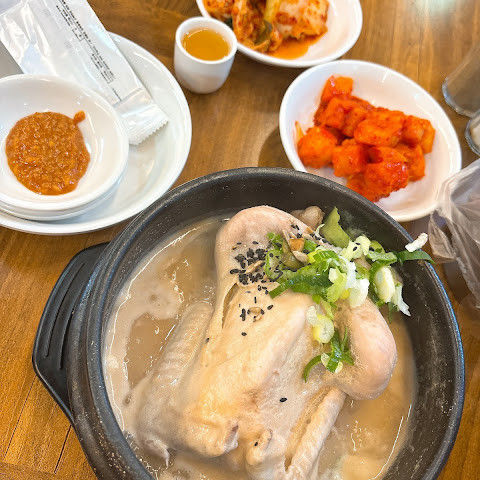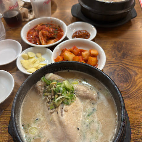 이 인기 삼계탕집을 처음 방문했는데, 오후 3시가 넘었는데도 사람이 많지 않았어요. 메뉴에 선택지가 많지 않아서 삼계탕과 해물파전을 주문했어요. 음식 준비는 빨랐고 주문하고 5분 안에 음식이 나왔어요. 계란을 듬뿍 넣어 만든 파전은 오믈렛 같은 맛이었고, 닭고기는 부드럽게 익었고 국물 맛도 훌륭했어요. 전반적으로 맛있고 든든한 식사였어요.