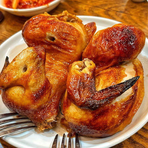 처음 주문한 전기구이통닭구이는 기름기 쫙 빼고 짚향 진하게 우러나서 전통적인 닭맛에 가까우면서도 구워서 그런지 크리스피하면서 속은 부드럽다.