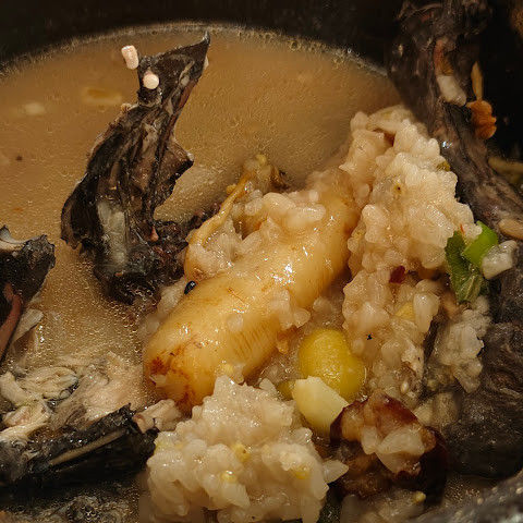 기본에 충실한 토속촌삼계탕은 견과와 삼계탕향이 어울려 좋은 냄새를 내서 먹기도 전에 침이 고인다. 인삼주도 같이 나와서 그냥 삼계탕에 붓고 먹으니 맛이 쌉싸름하고 고소하다. 살코기는 그저 젖가락질 살짝 건져올리면 부드럽게 발골되어 어르신도 무리없이 느낄수 있습니다. 인삼, 대추, 잣, 견과가 어울려 삼계탕이라기보다 몸에 좋은 보약을 먹는 느낌입니다.