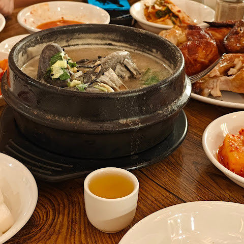 토속촌 삼계탕에 갔는데, 식사가 나오기도 전에 인삼주 한 잔이 나왔어요! 인삼 향이 정말 강했어요 😆 — 제 입맛에는 좀 너무 강했어요 — 하지만 삼계탕 자체는 정말 훌륭했어요. 닭고기는 부드럽고 잡곡밥과 부드럽게 볶은 인삼 뿌리가 통째로 들어 있었어요. 육수는 진하고 포만감이 있어서 쌀쌀하고 비 오는 날에 딱 좋았어요. 구운 닭고기도 정말 환상적이었어요. 겉은 바삭하고 속은 촉촉했어요. 강력 추천합니다! 🍲✨