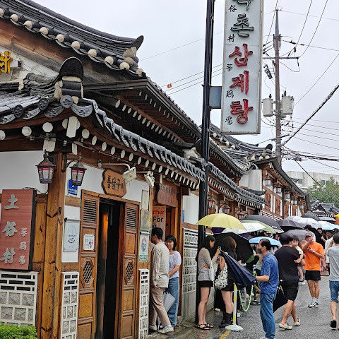 대궐같은 한옥에서 맛볼수 있는 견과류 국물의 삼계탕집. 비가 많이오는 평일오전에도 자리가 거의 다 차 있다. 삼계탕은 주문하면 짧은 시간안에 나온다. 미리 삶은 닭을 국물에 잠시 끓여 나오는 듯 했다.방문할때마다 항상 실내가 소란스럽고 정신없다는 느낌이 들면서도 대체재가 없는 곳이다 생각되는 곳