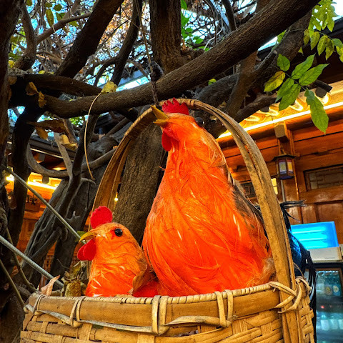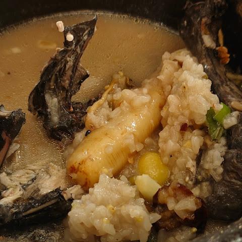 이 식당의 인삼닭국은 정말 최고예요. 국물은 걸쭉하면서도 부드러운 맛이었어요. 닭고기는 정말 부드러워서 살이 뼈에서 쏙 빠져 나왔어요. 닭고기 안에는 찹쌀밥, 대추, 인삼, 그리고 아마 다른 재료들이 들어 있었을 거예요. 반찬도 몇 가지 나오는데, 리필 가능해요.