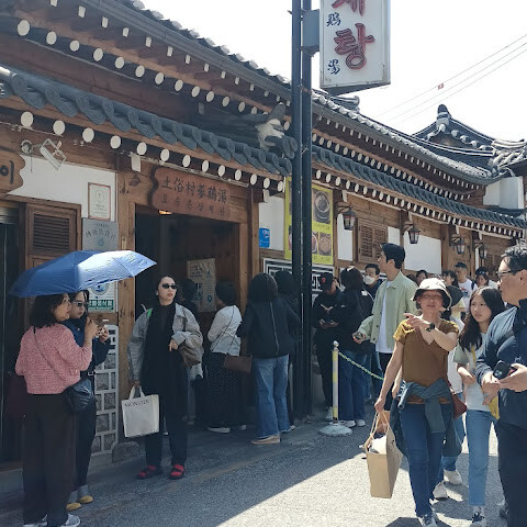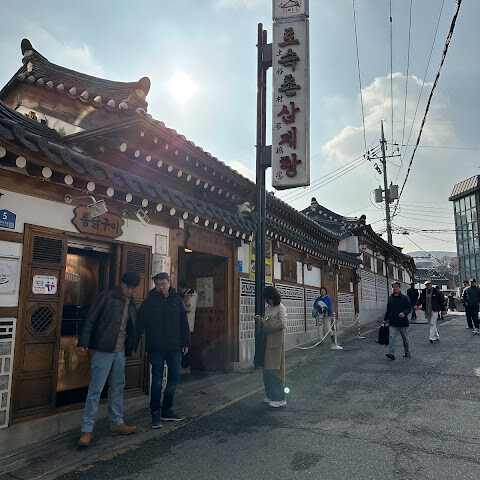 경복궁 근처에 위치한 오랜 전통의 삼계탕은 명성에 걸맞게 인삼계탕으로 유명합니다. 닭고기는 뼈에서 살이 쏙쏙 떨어질 정도로 푹 끓여내고, 찹쌀은 국물을 흠뻑 머금으며, 통인삼과 약주를 넣어 깊고 풍부한 맛을 자랑합니다. 전통 한옥과 다다미 좌석은 따뜻한 분위기를 자아내고, 서비스 또한 신속합니다. 하지만 모든 손님이 개별적으로 주문해야 하는 경직된 규칙과 차갑고 심지어 불친절한 직원들의 태도는 새로운 음식을 경험해보고 싶어하는 관광객들에게는 매우 불친절하게 느껴질 수 있습니다. 구운 닭고기와 같은 다른 메뉴의 질은 다소 떨어지고, 가격은 눈에 띄게 높은 편입니다. 따라서 점심과 저녁 피크 시간을 피하고, 대표 메뉴인 인삼계탕에 집중하며, 다른 메뉴나 부가 서비스는 큰 기대를 하지 않는 것이 좋습니다. 전반적으로 전통적인 맛을 경험하기에는 좋은 곳이지만, 서비스 경험은 다소 실망스러울 수 있습니다.