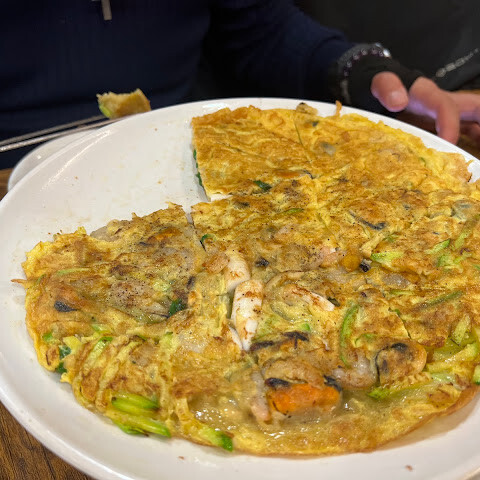 해산물파전에는 오징어, 조개류, 파가 눈에 띄게 들어있어 먹을 수 있었고, 겉은 바삭하지 않고 한국식 해산물파전 특유의 부드럽고 촉촉한 식감이었습니다.