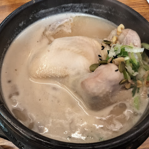 대궐같은 한옥에서 맛볼수 있는 견과류 국물의 삼계탕집. 비가 많이오는 평일오전에도 자리가 거의 다 차 있다. 삼계탕은 주문하면 짧은 시간안에 나온다. 미리 삶은 닭을 국물에 잠시 끓여 나오는 듯 했다.방문할때마다 항상 실내가 소란스럽고 정신없다는 느낌이 들면서도 대체재가 없는 곳이다 생각되는 곳