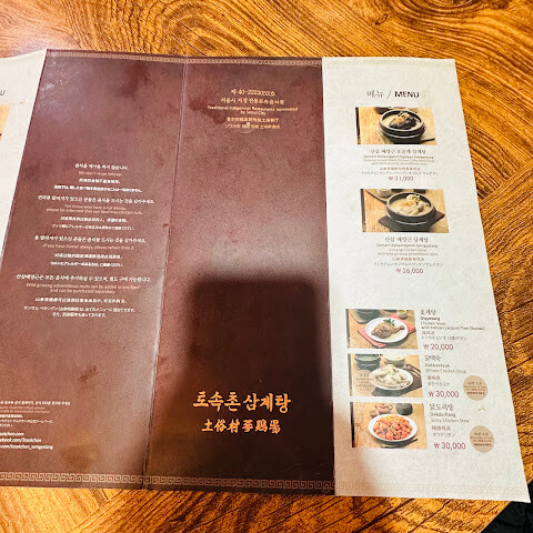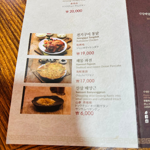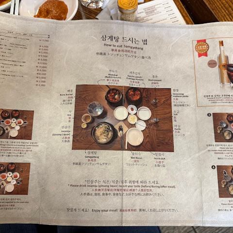 식당 메뉴판에는 인삼닭탕 만드는 법이 적혀 있었습니다. 국물은 쌀, 통대추, 인삼, 연자 등 필수 재료가 듬뿍 들어있어 양이 푸짐했습니다. 인삼주 한 잔도 서비스로 함께 나왔습니다. 팬케이크도 맛있었습니다.