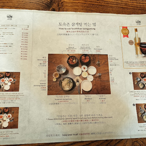 유명한 인삼국기집이라 그런지 메뉴가 중국어, 영어, 일본어로 제공되어 관광객들이 주문하기에 아주 편리했어요. 국물을 어떻게 먹어야 하는지에 대한 설명도 센스 있게 적어 놓았더라고요.
