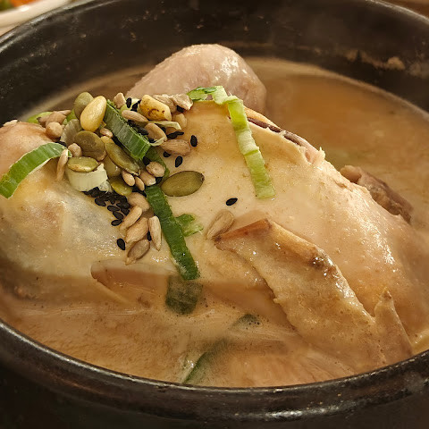 이 인기 삼계탕집을 처음 방문했는데, 오후 3시가 넘었는데도 사람이 많지 않았어요. 메뉴에 선택지가 많지 않아서 삼계탕과 해물파전을 주문했어요. 음식 준비는 빨랐고 주문하고 5분 안에 음식이 나왔어요. 계란을 듬뿍 넣어 만든 파전은 오믈렛 같은 맛이었고, 닭고기는 부드럽게 익었고 국물 맛도 훌륭했어요. 전반적으로 맛있고 든든한 식사였어요.