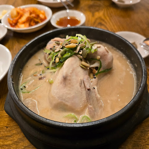 삼계탕으로 유명한 곳인데, 명성에 걸맞은 맛이었습니다. 인삼닭탕은 진하고 속이 든든해지는 풍미가 가득했어요. 다만, 닭구이는 기대했던 것만큼 촉촉하지 않고 약간 건조했습니다. 그래도 삼계탕 때문에라도 꼭 한번 방문할 만한 곳이에요!