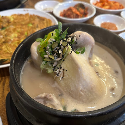 끊임없이 손님이 몰리는 가운데서도 회전율이 놀라울 정도로 빠르고, 서비스는 서두르는 느낌 없이 신속하게 제공되었습니다. 바삭한 파전과 아삭한 김치 등 곁들여 나오는 반찬들도 식사와 훌륭한 조화를 이루었습니다. 서울에서 푸짐하고 정통적인 삼계탕을 경험하고 싶다면 꼭 방문해야 할 곳입니다.