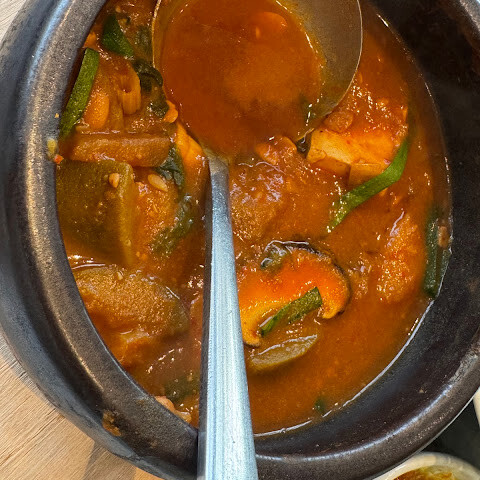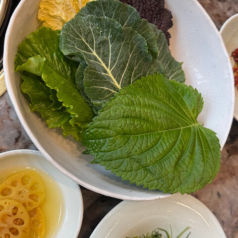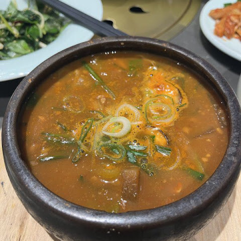 된장찌개는 정말 오랫만에 먹어본 최고의 맛이었어요. 보글보글 끓는 검은 돌솥에 담겨 나왔는데, 국물 위에 신선한 부추가 듬뿍 올려져 있었어요. 밑반찬도 푸짐했고, 짙은 회색 대리석 테이블과 어우러진 음식들이 보기에도 좋았어요. 저희에게 가장 큰 장점은 식당 구조였어요. 천장이 높고 테이블 간 간격이 넓어서 다른 한국식 바비큐 식당들과 달리 공기가 맑고 담배 냄새가 배지 않았어요. 정말 편안하고 맛있는 가족 식사를 즐길 수 있는 곳이었어요.