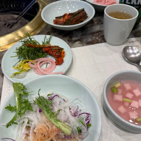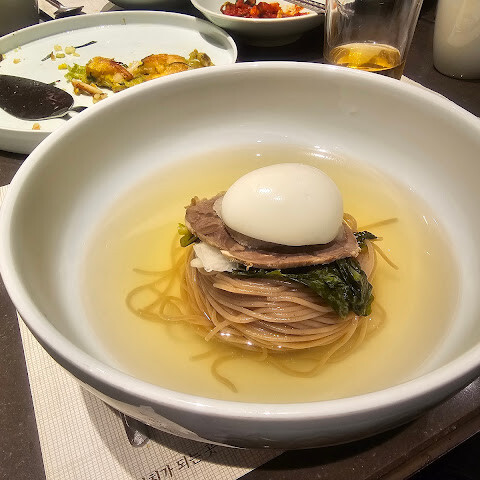 전채요리로 편채를 주문하고 얇게 썰린 드라이에이징 갈빗살에, 살짝 간장을 얹어 녹이고 야채 가득 올려 함께 나온 와사비와 당근무침을 얹어 먹으니 너무 맛습니다. 4인가족이면 더 가볍게 먹기 좋겠어요. 야채를 가득 해도 남을 정도이니 양껏 먹어도 될것 같습니다. 밑반찬들도 깨끗한맛이고,. 본격 한우갈비와 양념갈비를 구워 먹었는데, 간이 전혀안된 생갈비라 정말 오랜만에 맛있는 갈비를 즐겼어요. 냉면은 평냉스타일이고, 김치말이도 딱 좋아요 ㅎㅎ 여러요소들이 미슐랭임을 증명합니다. 👍