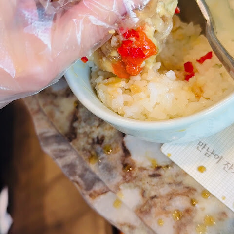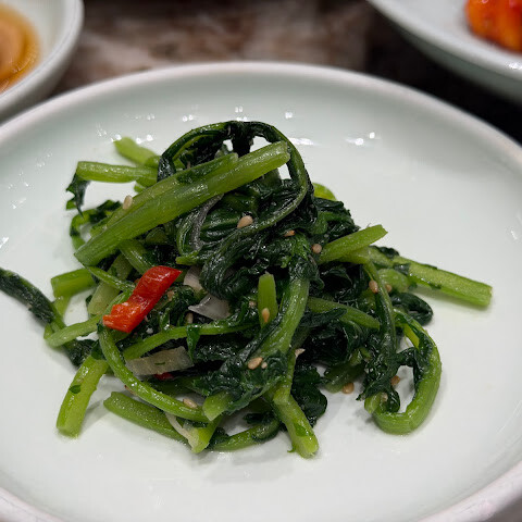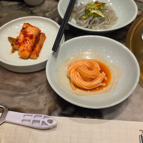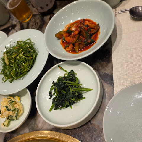 서울에 올 때마다 우리 가족이 꼭 가봐야 할 곳이 되었습니다. 세 번째 방문인데 음식은 항상 맛있었어요. 꼭 주문해야 할 메뉴는 엉겅퀴밥(전복 슬라이스, 구운 김, 딥소스가 함께 나오는 아주 특별한 메뉴), 불고기 세트(최소 2인분), 국수와 면 중 선택이 가능하고, 특별 메뉴(저희는 신선한 간장 군만두를 먹었는데 정말 맛있었어요!)입니다. 반찬은 정말 신선해서 고기 요리와 잘 어울렸어요. 양념갈비도 꼭 주문해야 해요. 매콤한 오징어도 주문했는데 너무 질겨서 잘 먹지 못했어요.