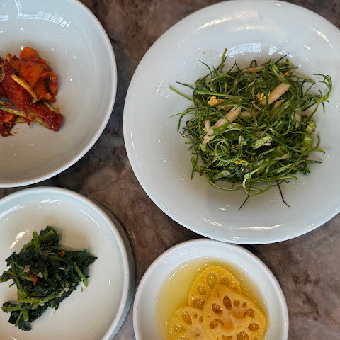 서울에 올 때마다 꼭 가는 곳이 되었습니다. 세 번째 방문인데 음식은 항상 맛있었어요. 꼭 주문해야 할 메뉴는 엉겅퀴밥(전복 슬라이스, 구운 김, 딥소스가 함께 나오는 아주 특별한 메뉴), 불고기 세트(최소 2인분), 국수와 면 중 선택 가능, 그리고 특별 메뉴(저희는 신선한 간장 군만두를 먹었는데 정말 맛있었어요!)입니다. 반찬은 정말 신선해서 고기 요리와 잘 어울렸어요. 양념갈비도 꼭 주문해야 해요. 매콤한 오징어튀김도 주문했는데 너무 질겨서 잘 먹지 못했어요.