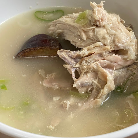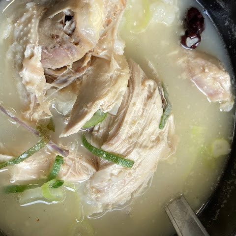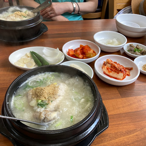 아내와 저는 아주 만족스러운 식사를 했습니다. 작은 인삼주는 국물에 넣지 않고 작은 컵에 직접 따라줍니다 (마스터가 막으실 거예요). 인삼 닭은 양이 푸짐하고, 육수는 돼지고기 덮밥처럼 담백합니다. 후추나 함께 나오는 간장(?)으로 간을 하면 됩니다. 통닭은 양도 푸짐하고 가격도 적당합니다 (믿기지 않으시면 신주에 오세요).