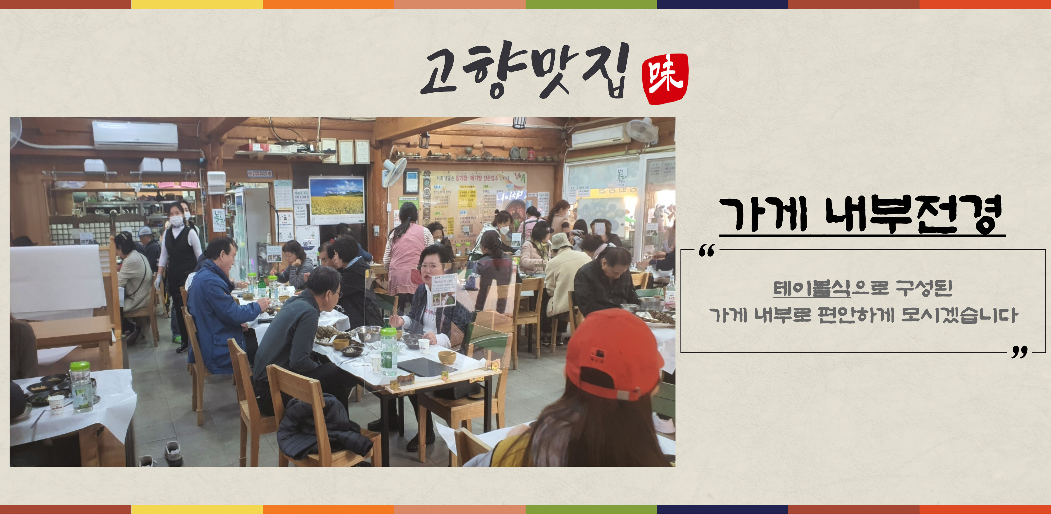 화개장터 삼거리에 있는 정육식당이다. 말 그대로 정육점과 식당을 함께 운영하는 집이다. 이 집에 들어서면 빨간 형광등이 켜진 정육점과 음식을 만드는 주방이 좌우로 마주 보고 있다. 한쪽 벽에는 '농림부 선정, 남원시 지정 로하스골드-지리산 고랭지 허브 흑돈'이라는 현판이 걸려 있다. 남원에 있는 운봉고원에서 허브를 먹여 기른 검정 돼지고기를 판매한다는 것이다. 정병원 사장은 이 흑돼지를 기르는 친환경 향돈촌영농조합법인의 조합원. 줄기차게 이곳에서 기른 돼지고기를 사용하는 이유이다. 쌈을 싸먹는 배추, 상추, 갓 등 기본적인 채소는 손수 기른 것이다. 메주를 담근 콩은 하동산이고 된장과 간장은 집에서 담근다. 소금은 화개농협에서 단체로 구입하는 신안 천일염을 쓴다. 고기를 구워 먹는 석쇠는 스테인리스 관에 물을 순환시켜 고기를 익히는 최신식을 사용한다. 고기가 잘 타지 않고, 오래 식지 않는다.