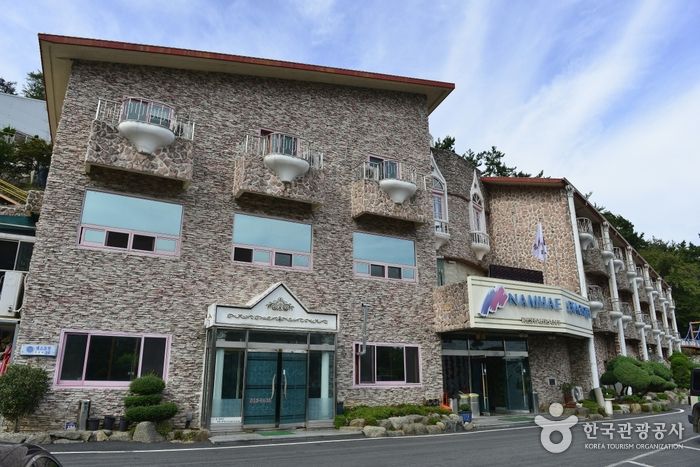 건물은 현대식 3층 자연석 건물로 되어 있는데, 산허리에 있는 옥돌청석을 2년 동안이나 깎아내어 건축하였다. 앞과 옆에 있는 언덕은 3톤 크기의 자연석으로 조경을 하여 웅장하고 산뜻하며 주변에는 소나무, 향나무가 건물을 에워싸고 있어 수려한 경관을 보여준다. 객실 복도와 연결된 축소판 남해대교를 걸어서 오솔길로 남해대교를 산책할 수 있도록 하였으며, 비치텔 상부의 3,966.96m²(1,200평) 농장과 남해대교가 있는 19호선 국도를 연결하였다. 가족단위 손님을 위하여 가족단체실 5실이 있다. |
