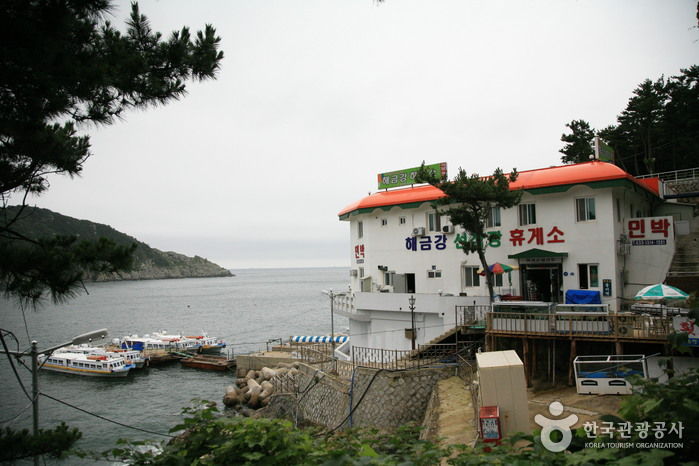 육지의 제일 끝단이며, 유람선 선착장 위쪽에 있는 하얀 건물이 바로 해금강 하우스다. 거제도에서 주변 경관으로만 따진다면 최고로 평가될 만한 펜션이다. 해금강이 한눈에 내려다보이고, 사자바위 너머로 떠오르는 일출을 침대나 객실에서 볼 수 있는 유일한 곳이다. 해금강을 오가는 유람선이 눈앞에 지나다니고, 갯바위에서 바다낚시를 즐기는 강태공들의 표정까지 볼 수 있는 바닷가에 있다.