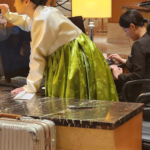 호텔 서비스는 흠잡을 데 없이 훌륭했습니다. 버스에서 내리자마자 한국인 남성이 짐을 옮겨주었고, 곧이어 "로비 매니저"가 나타나 우리 이름을 묻고 손에 든 작은 카드와 대조해 정보를 확인한 후 프런트 데스크로 안내했습니다. 접수원은 영어를 더 잘하는 남성 접수원에게 우리 두 외국인과 대화할 기회를 주었습니다. "로비 매니저"는 시스템에서 제가 시니어 회원인지 확인한 후, 짐을 5층 라운지로 가져가 체크인을 도와주었습니다.