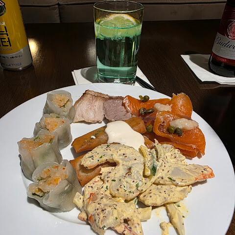 먼저 아침 식사는 매일 오전 6시부터 10시까지 제공됩니다. 저는 3일 동안 머물렀는데, 메뉴는 매일 같았고, 김치, 샐러드, 과일 같은 사이드 메뉴만 바뀌었습니다. 아침 식사는 10시에 정확히 끝나는데, 이때 청소기가 나오므로 라운지에서 나가는 것이 좋습니다. 음식은 신선했고, 오믈렛과 계란 요리를 즉석에서 만들어주는 코너도 있었습니다.