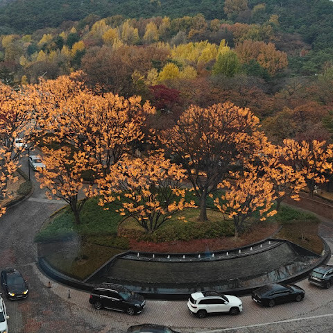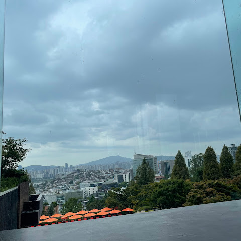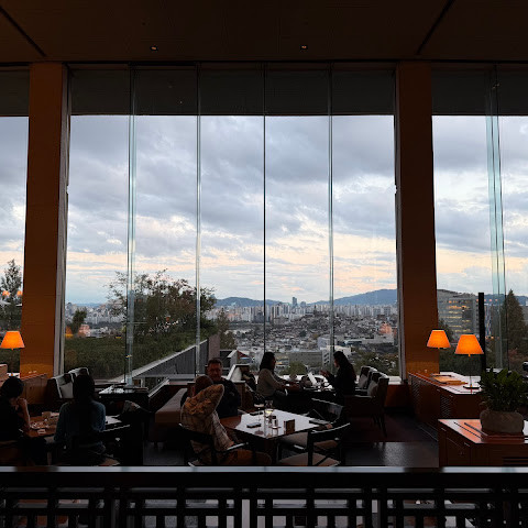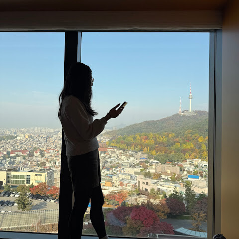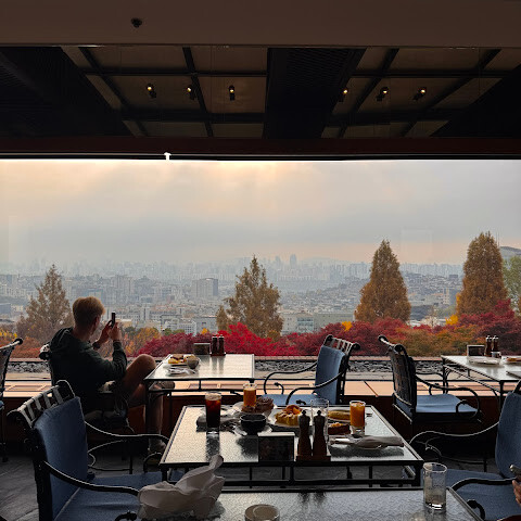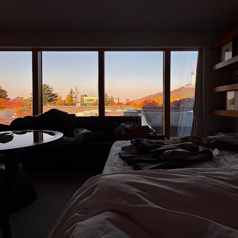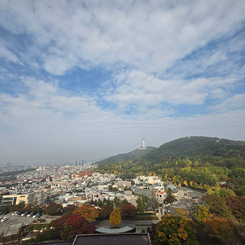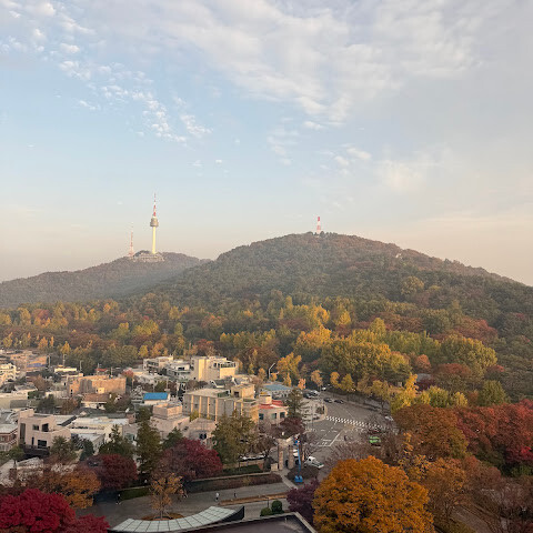 정말 좋았어요. 하지만 호텔 투숙객이라면 발코니에 앉을 수 있다는 건 기본이겠죠. 남산타워와 단풍, 노란 은행나무가 보이는 멋진 전망이 펼쳐지고, 공원, 카페, 버스 정류장까지 걸어갈 수 있어요. 택시는 항상 대기하고 있어요.