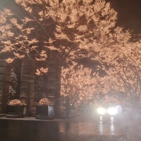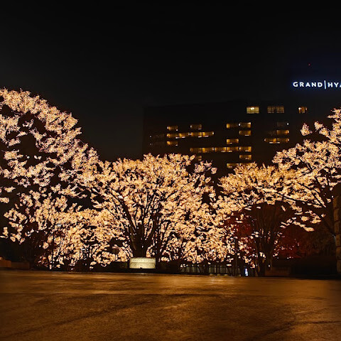 아름답게 조명된 나무들이 마치 동화 속 세상처럼 아름다운 곳이에요 (객실에서도 멋진 경치를 감상할 수 있어요!).