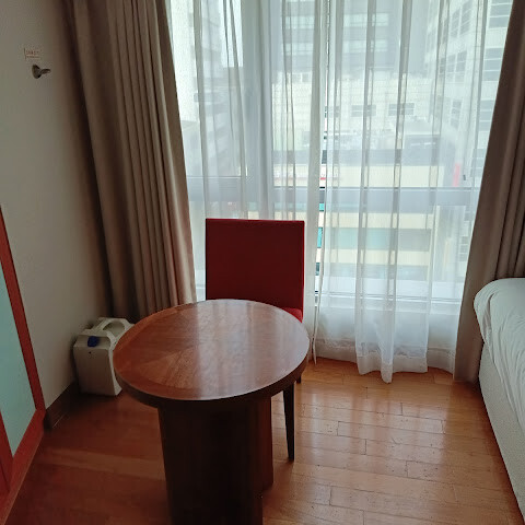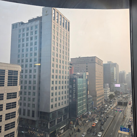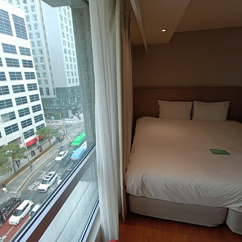 호텔은 매우 깨끗하고 정돈되어 있습니다. 사진에서 보시다시피, 명동이라는 최적의 위치에도 불구하고 객실 공간이 상당히 넓습니다. 침대는 부드럽고 편안하며, 큰 창문을 통해 명동의 아름다운 도심 전경을 한눈에 감상할 수 있습니다.