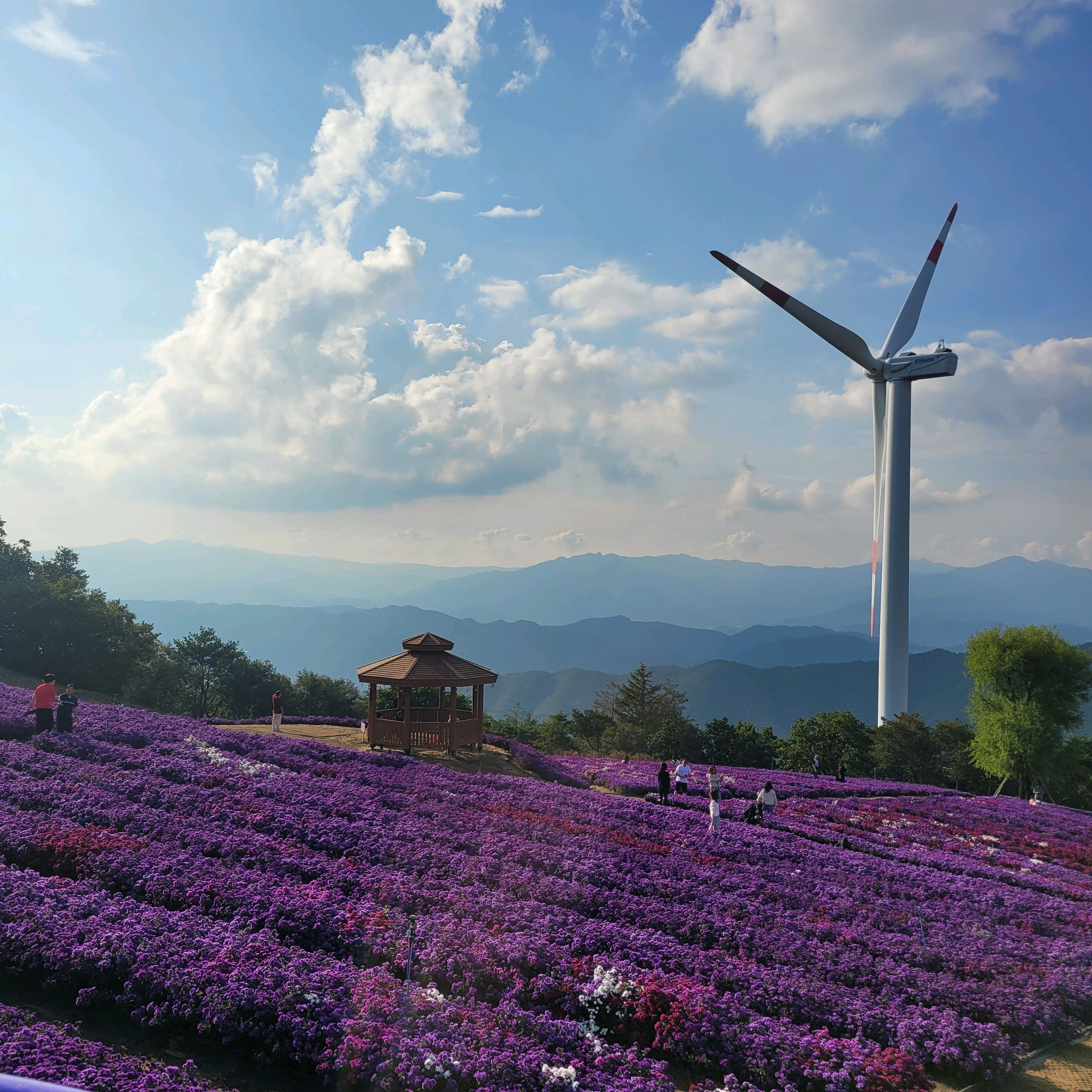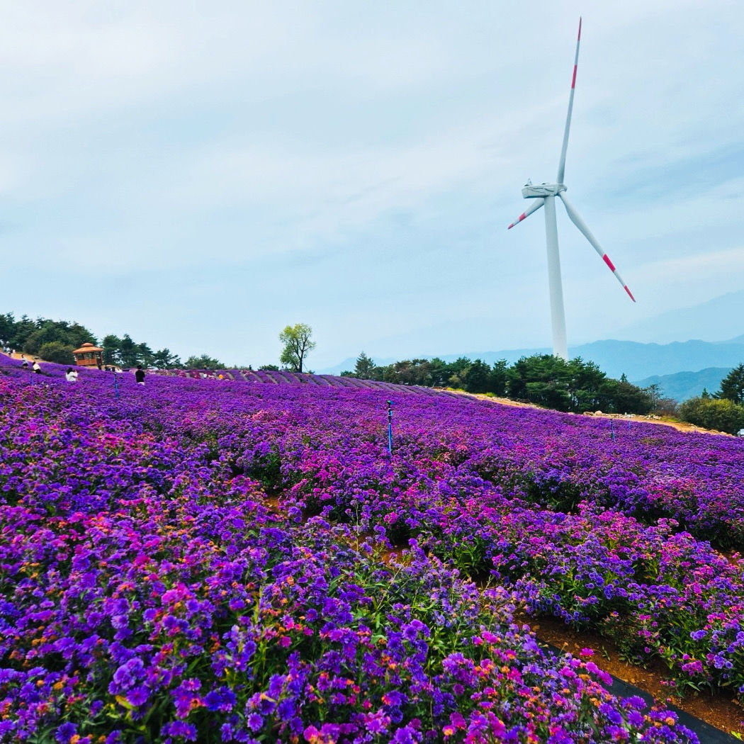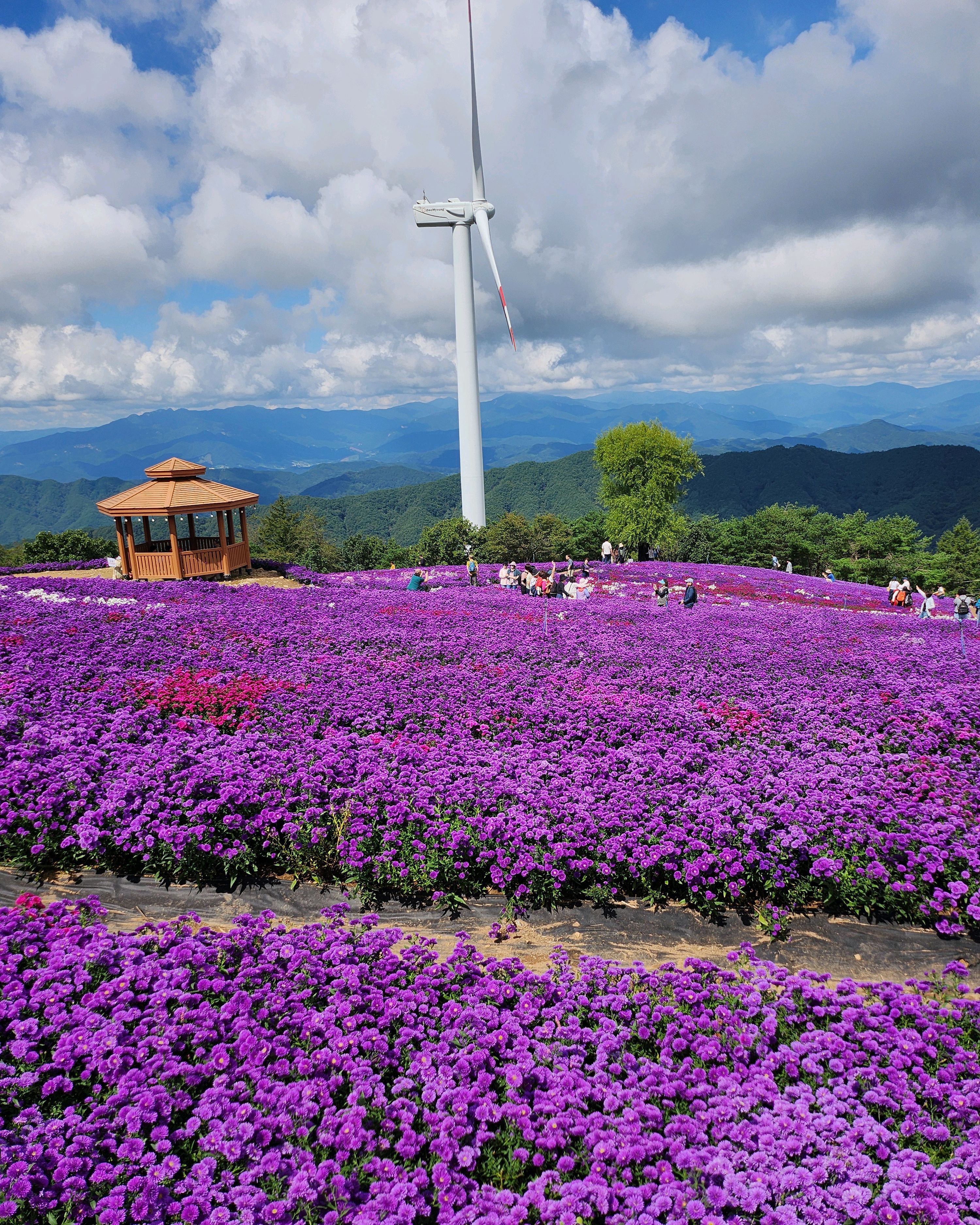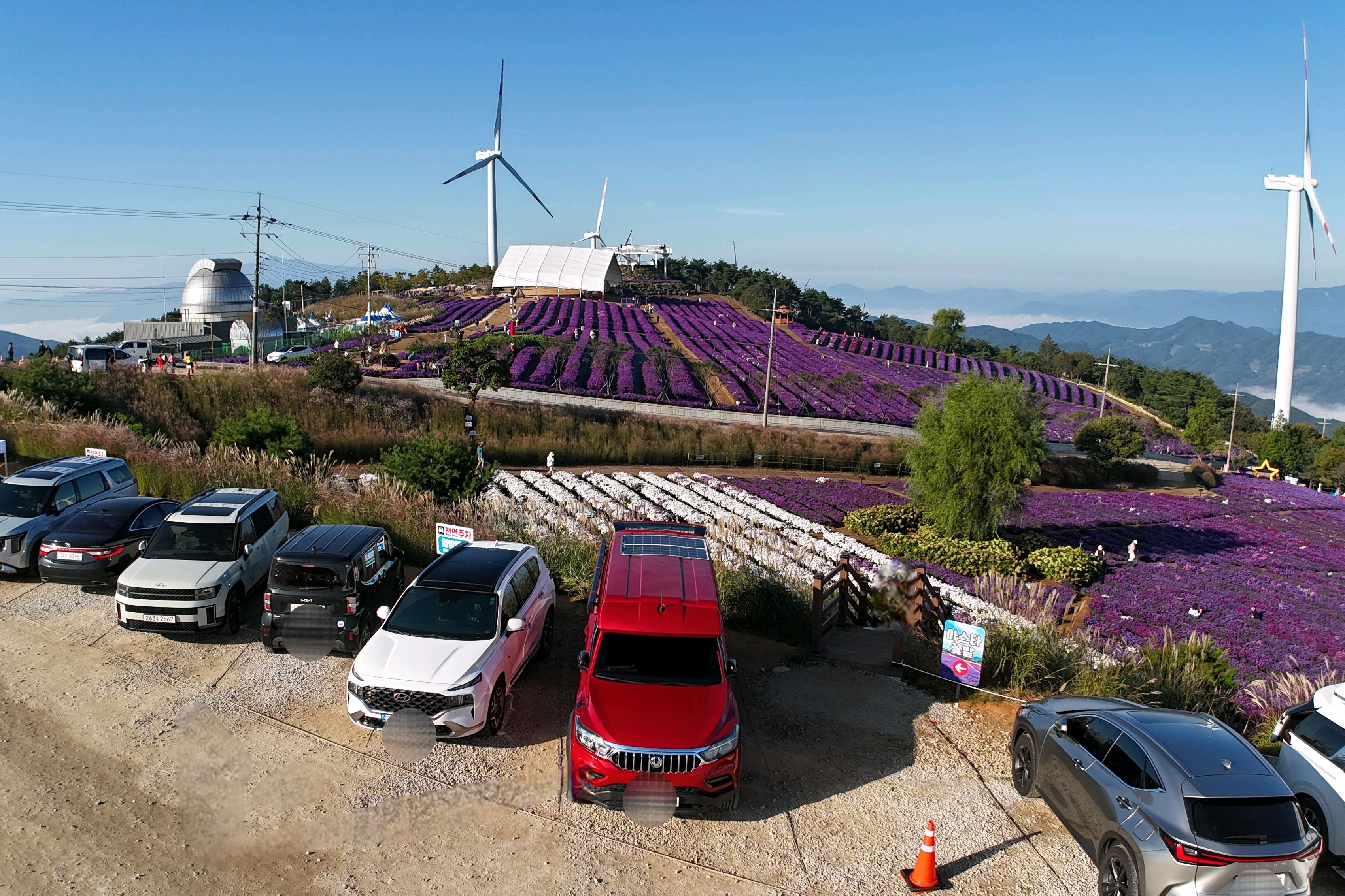 거창 감악산은 매년 9월 말이 되면 사람들의 행렬로 문전성시를 이룹니다. 지난 9월 19일부터 10월 12일까지는 감악산 풍력단지 인근에 이스타국화가 만개하여 감악산 별바람 언덕에 감악산 꽃별축제가 펼쳐집니다. 고지대의 언덕에 피어난 보라색 국화는 이루 형용할 수 없을정도로 아름다운데요. 축제기간에 차가 밀리고 계속 등판길이라 운전은 조심하셔야 해요. 정상에는 수백대 규모의 주차장, 공영화장실, 등 축제 기반시설이 마련되어있더군요.