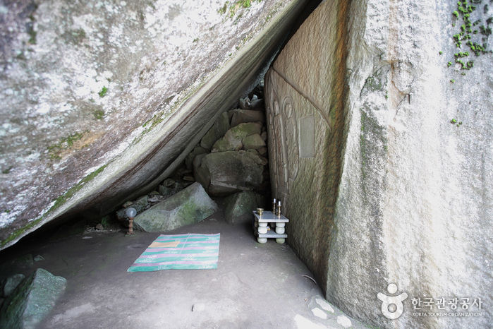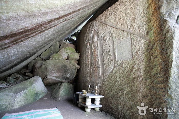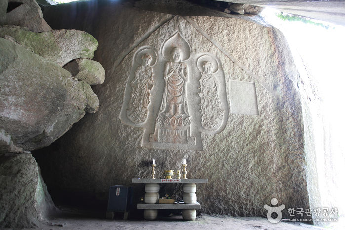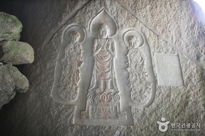 금원산 북쪽 골짜기 큰 바위굴에 새겨져 있는 마애삼존불이다. 뒤의 돌계단을 오르면 바위굴이 있고, 안쪽 남향 바위에 삼존불이 새겨져 있다. 삼존불의 부분을 삼각선으로 그어 구획하고, 가운데는 보주형으로 다듬어 세 분의 부처를 새겼다. 중앙의 부처가 두 보살을 좌우로 거느린 모양이다. 중앙은 아미타여래, 오른쪽은 관음보살, 왼쪽은 지장보살로 보인다.