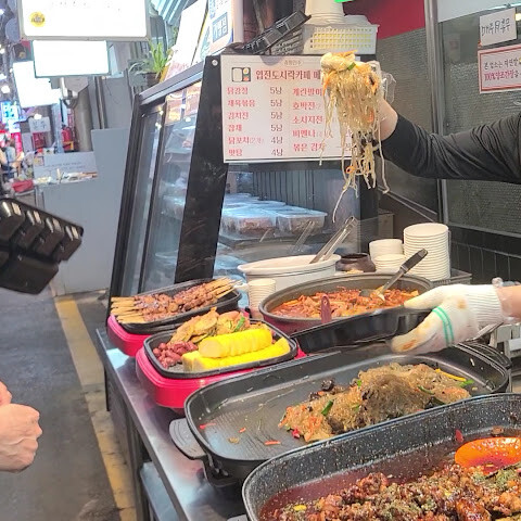 특히 혼자 식사할 때 정말 재미있고 독특한 음식 경험을 선사하는 곳입니다. 10,000원에 전통 동전과 도시락통을 받아서 시장 곳곳의 다양한 노점에서 원하는 음식을 마음껏 담을 수 있어요. 동전을 더 구매하거나, 필요한 만큼 덜 사용하거나, 정가로 주문할 수도 있지만, 여러 가지 음식을 조금씩 맛보기에 딱 좋은 구성입니다.<br><br>떡볶이부터 만두까지 다양한 음식이 준비되어 있고, 원하는 음식을 담은 후에는 위층에 있는 식사 공간으로 올라가면 좌석, 식기, 음료는 물론 밥이나 면까지 주문해서 푸짐하게 즐길 수 있습니다.<br><br>광장시장처럼 큰 규모는 아니지만, 직접 체험해 볼 수 있고 가격도 저렴해서 혼자 식사할 때 특히 다양한 음식을 조금씩 맛보기에 안성맞춤입니다!