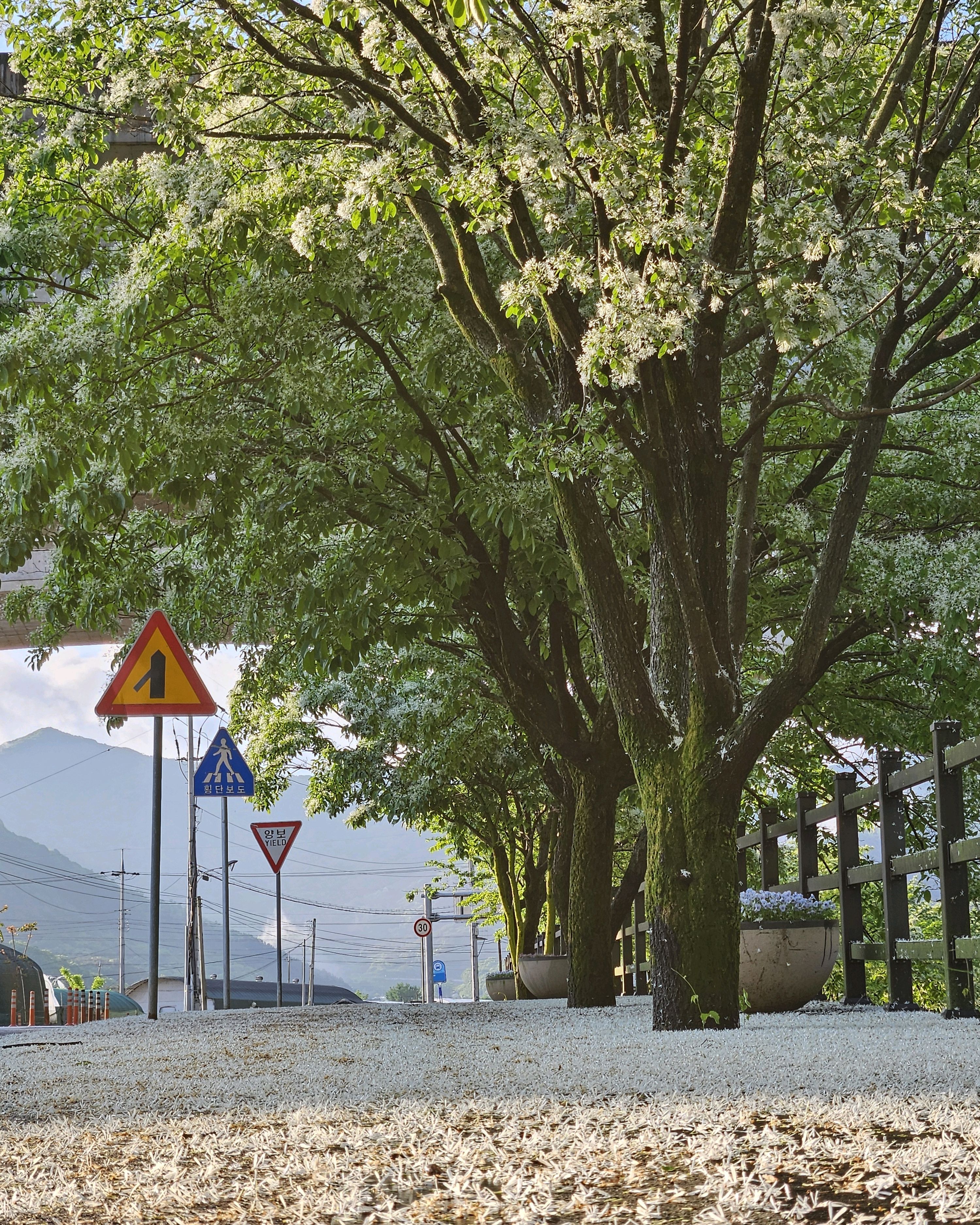 가는길 가로수가 이팝나무인데 꽃비가 내렸어요