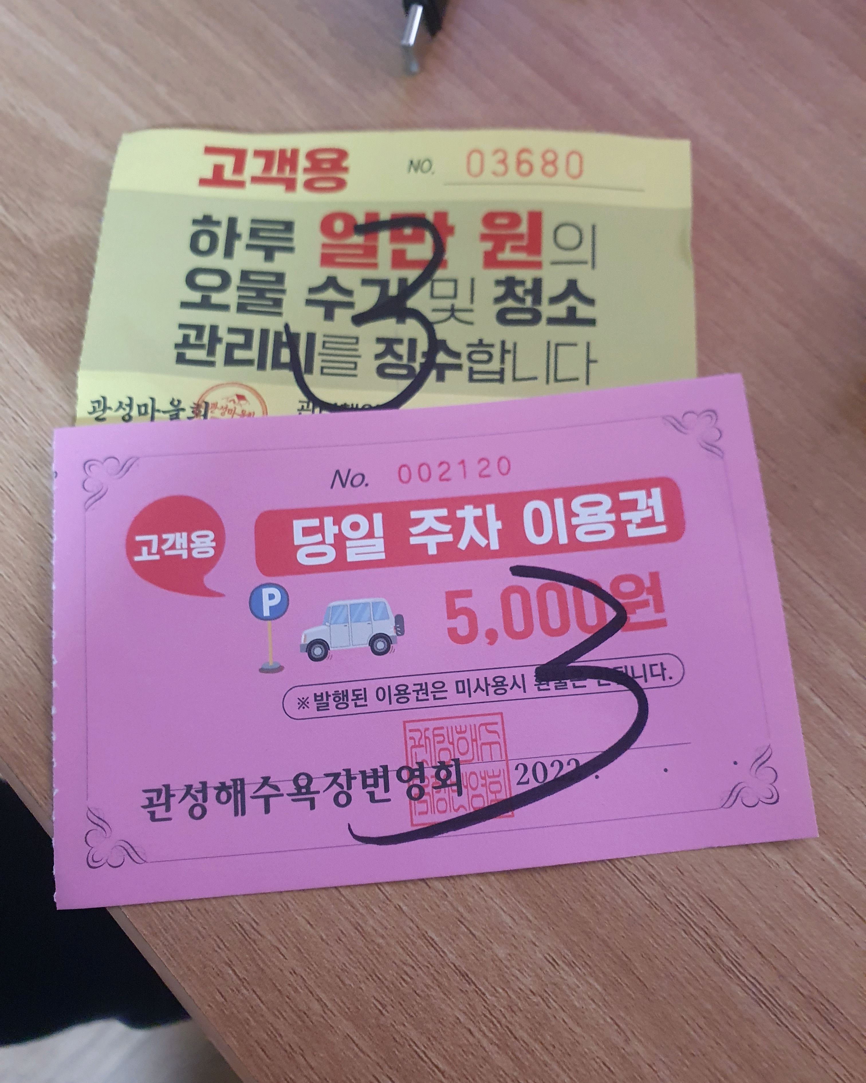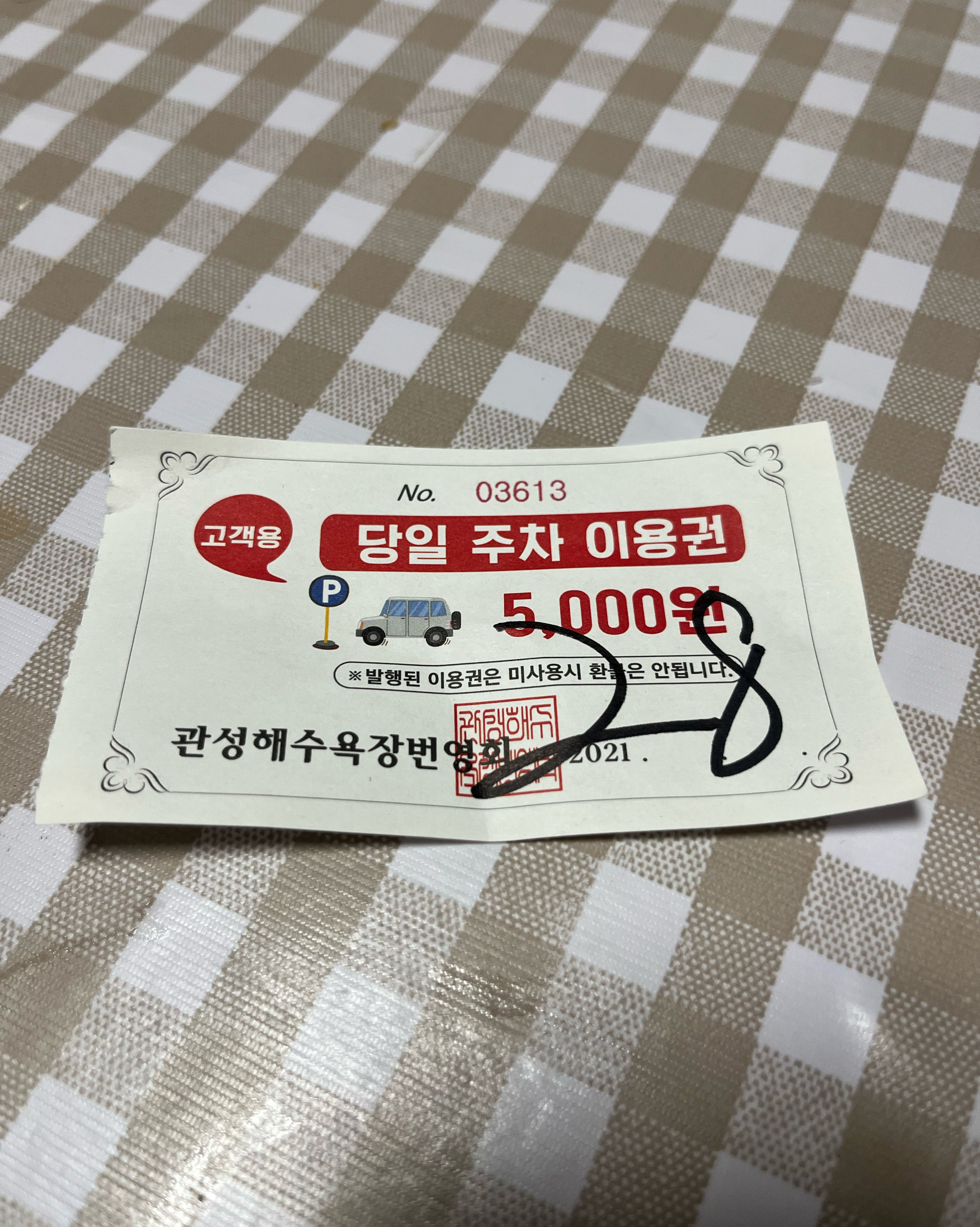 관성솔밭해변에 들어가는 일반도로를 막아두고 옆에 주차장을 통해서 들어가게 해뒀네요. 캠핑장에 들어가려면 주차이용권을 사야된다길래 말싸움하기 싫어서 그냥 샀네요. 해변 일박 이용비 만원은 따로 냈구요. 주차장 지나가는 비용 5천원 넘비싸고 첫 차박여행이었는데 별로 기분이 좋지 않았네요.