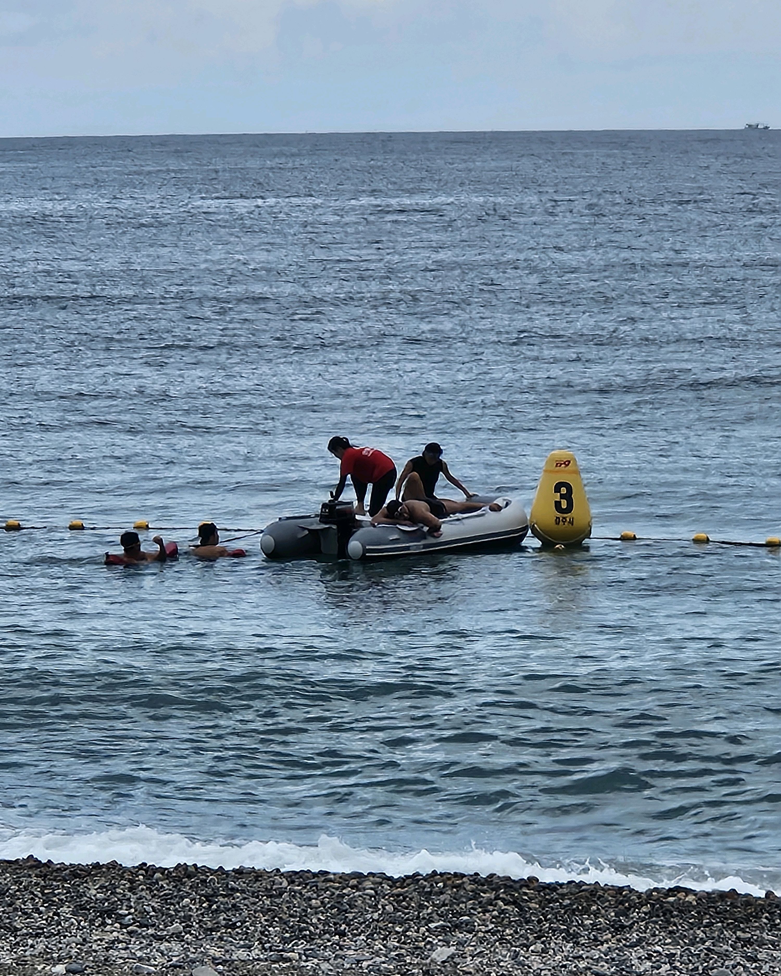 물이 너무 차가웠고 해파리 나와서 안전요원이 처리하는과정이