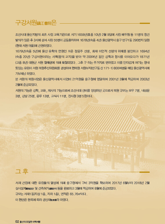 포은 정몽주와 회재 이언적의 위패를 봉안한 서원으로 강학과 교화, 제향 등을 하며 조선시대 선비를 양성했다. 숙종 4년(1678)에 세웠으며 숙종 20년(1694)에 구강서원이라는 사액을 받아 약 200여 년 동안 강학과 향사를 봉행해 오다가 흥선대원군의 서원철폐령으로 고종 8년(1871)에 철폐되었다. 훼철된 후 옛터는 주거지로 변하였고 이를 안타깝게 여기던 지역 유림들이 서원복원 추진위원회를 결성하여 서원부지 800여 평을 매입하고 울산광역시에 기부채납해 복원했다. 현재는 한문교실, 청소년 인성 및 예절교육, 주부예절 및 교양강좌 등을 무료로 운영한다.