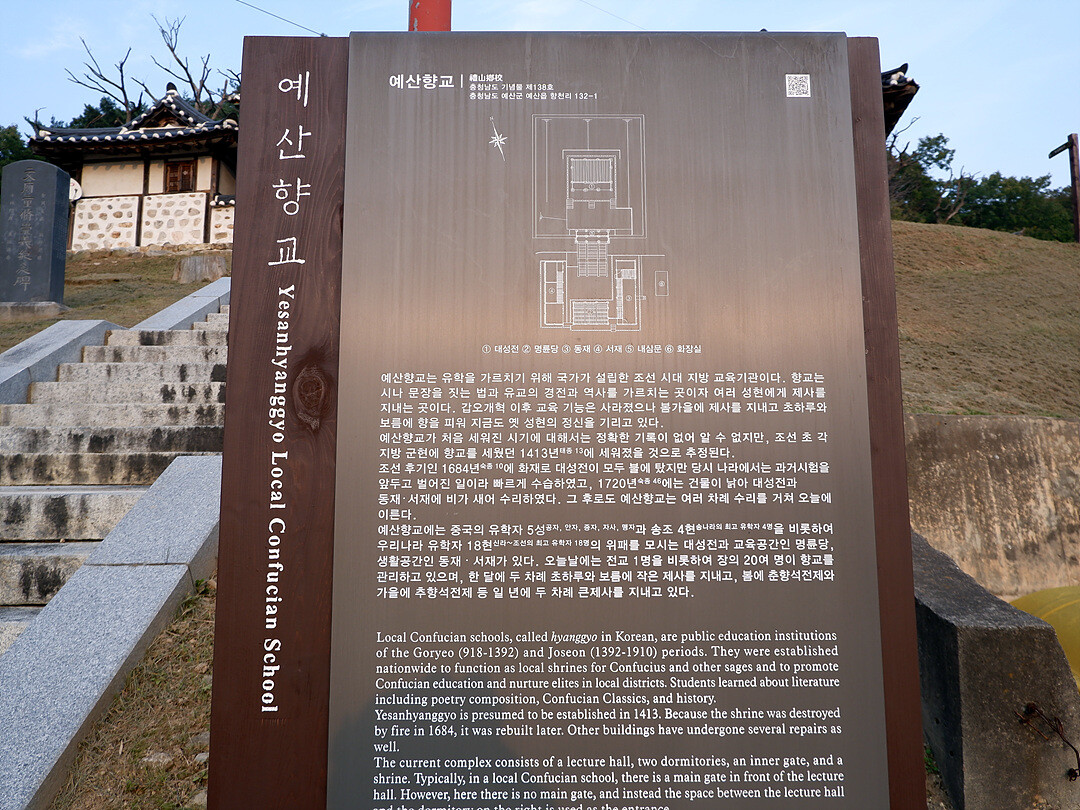 예산향교는 예산읍에 있는 조선시대의 향교이다. 이 향교가 처음 세워진 시기에 대해서는 정확한 기록이 없어 알 수 없지만, 조선 초 각 지방 군현에 향교를 세웠던 1413년에 세워졌을 것으로 추정된다. 조선 후기인 숙종 10년(1684)에 화재로 대성전이 모두 불에 탔지만, 당시 나라에서는 과거시험을 앞두고 벌어진 일이라 빠르게 수습하였다고 한다. 예산향교는 한 달에 두 차례 초하루와 보름에 작은 제사를 지내고, 봄에 춘향석전제와 가을에 추향석전제 등 일 년에 두 차례 큰 제사를 지내고 있다. 또한, 지역 문화재 활용 사업의 일환인 전통문화학교를 운영, 전통문화와 현대가 접목된 다양한 체험프로그램을 진행하고 있다. |