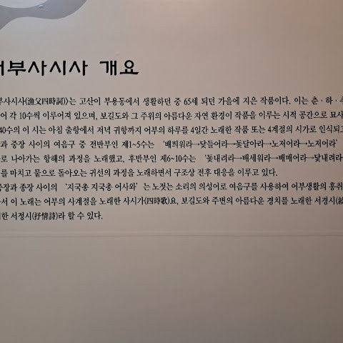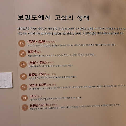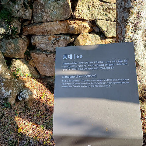위치와 풍경은 가히 제일 비경이다. 근데 지역이 윤선도 성역화에서 벗어나지 못한 기분이다. 그의 자유스러움과 기개를 높이고 싶다면 좀 다른 방식의 스토리가 필요하지 않을까? 하여튼 360도 풍경과 암석은 가히 표현의 단어가 생각나질 않는다.