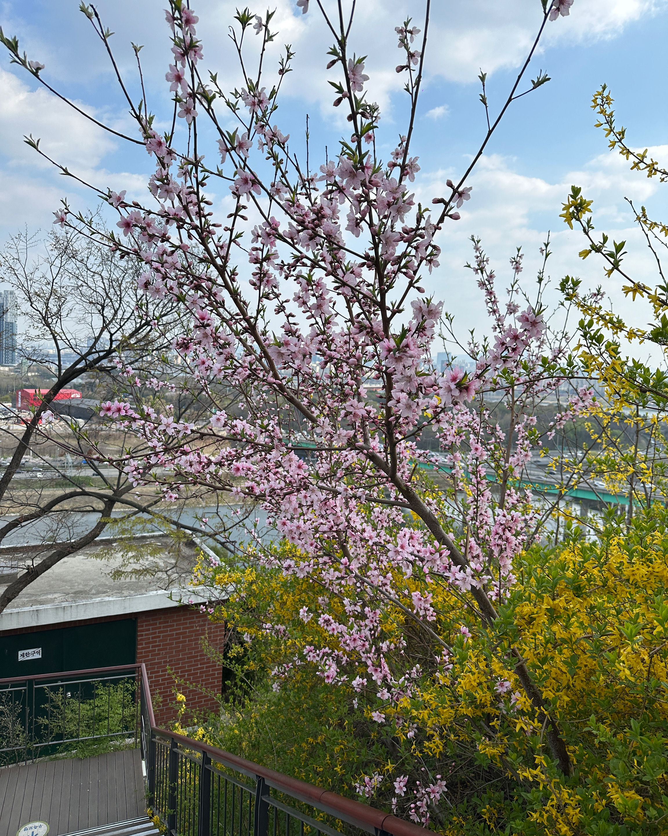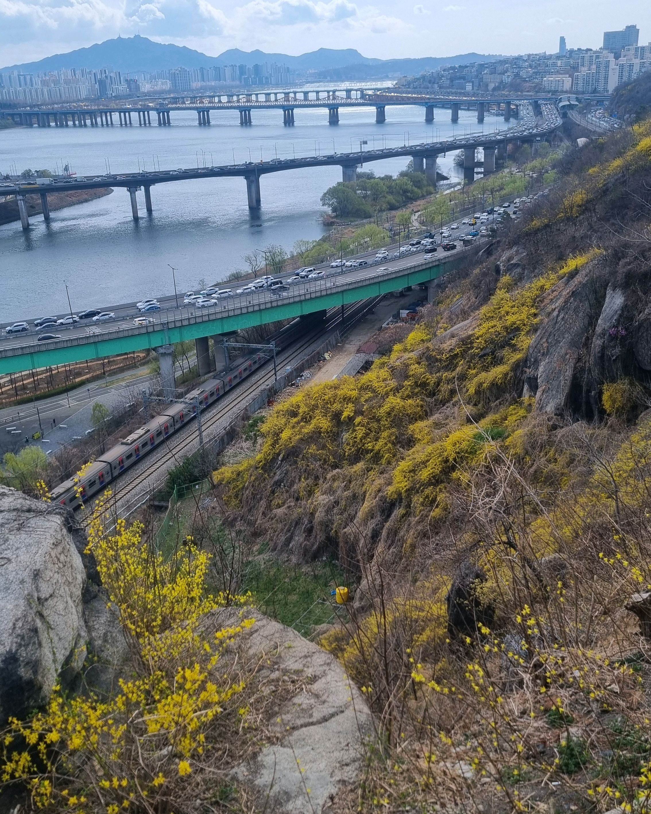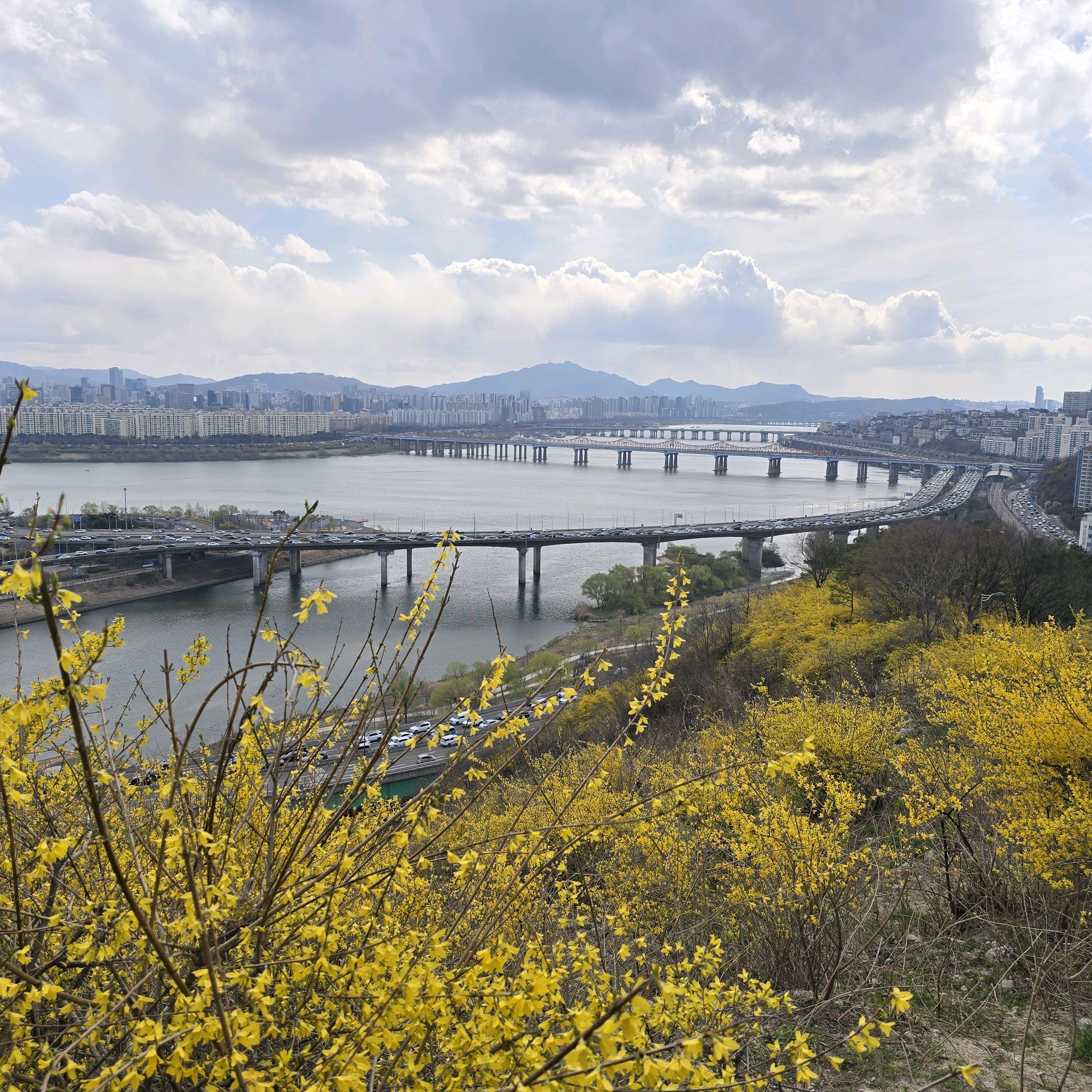 야경맛집 응봉산입니다. 한강과 중랑천이 만나는 곳에 위치해서 밤에가면 황홀한 한강 야경을 볼 수 있습니다. 개나리 피기 시작했네요. 주말쯤 절정일 것 같아요.
