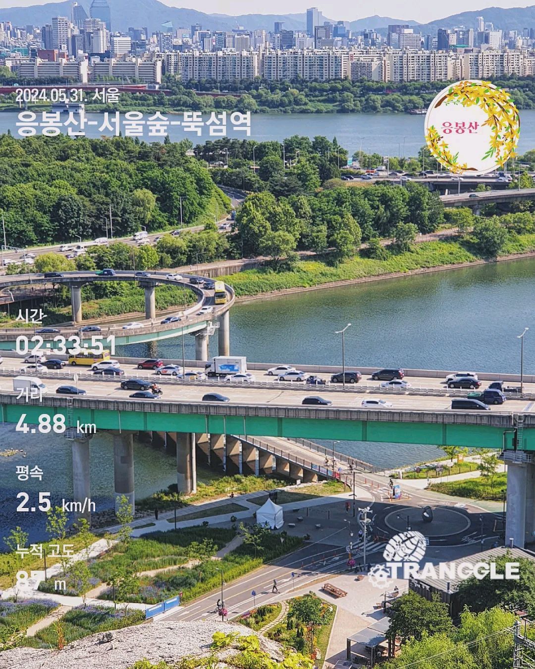 - 다만 정상 풍경이 굉장히 좋음. 중랑천-한강 합수부와 서울숲, 도로와 대교들을 둘러볼 수 있음