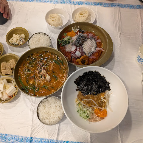 신선하고 맛있는 해산물 회와 오징어 국수 요리를 차갑게 제공합니다. 한국인의 주식/면 요리이지만, 외국인 입맛에 맞춰 다양한 맛을 즐길 수 있는 곳은 아닙니다. 메뉴가 많지 않고 다른 고기류처럼 선택지가 많지는 않습니다. 다만 게살 비빔밥과 이 지역에서 인기 있는 오징어 소시지는 있습니다.