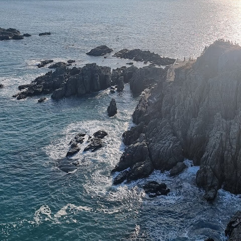 부산 오륙도는 아름다운 곳입니다. 인기 있는 관광지입니다. 유리다리를 건너면 절벽과 탁 트인 바다의 멋진 풍경을 감상할 수 있습니다. 멀리 부산 시내도 보입니다. 오후 4시쯤 되면 해가 지기 시작하고 하늘이 따뜻하고 부드러워집니다. 풍경은 더욱 아름다워지며 사진을 찍기 완벽한 시간입니다. 바다와 석양을 감상하기에 정말 평화롭고 기억에 남는 장소입니다.