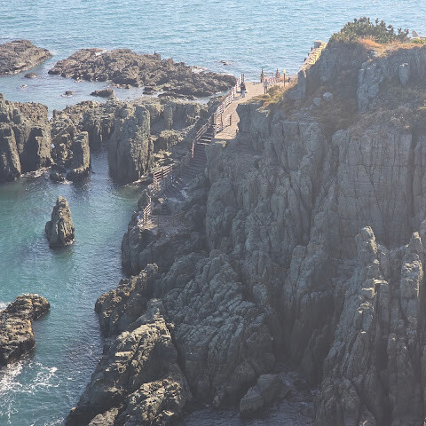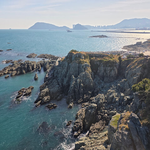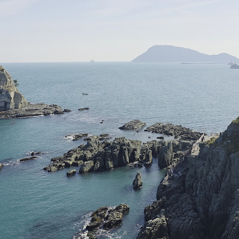 부산 오륙도는 아름다운 곳입니다. 인기 있는 관광지입니다. 유리다리를 건너면 절벽과 탁 트인 바다의 멋진 풍경을 감상할 수 있습니다. 멀리 부산 시내도 보입니다. 오후 4시쯤 되면 해가 지기 시작하고 하늘이 따뜻하고 부드러워집니다. 풍경은 더욱 아름다워지며 사진을 찍기 완벽한 시간입니다. 바다와 석양을 감상하기에 정말 평화롭고 기억에 남는 장소입니다.