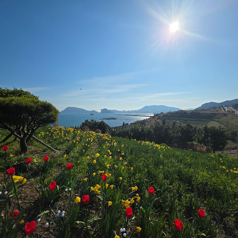 파란 하늘과 바다, 노란꽃, 빨간꽃, 초록풀...예뻐요
