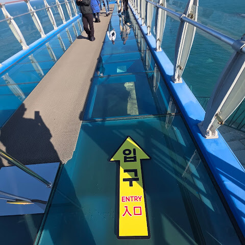 바다 위에 놓인 유리 다리.<br>아름다운 곳이지만 무섭기도 해요.<br>입장료는 무료입니다.<br>연령 제한은 없습니다.<br>드론 사용은 금지되어 있습니다.