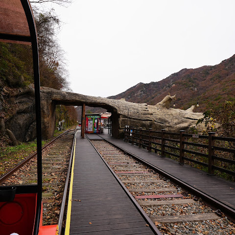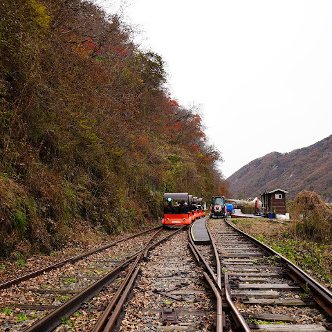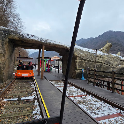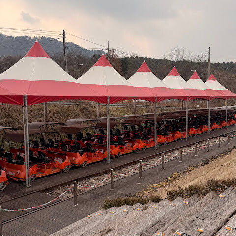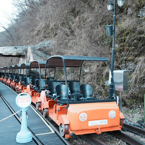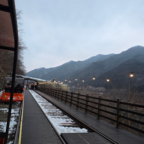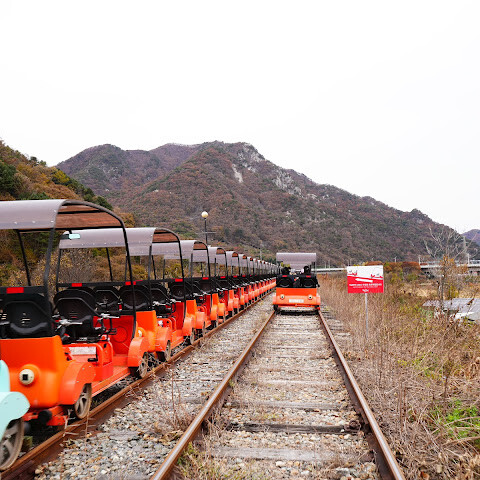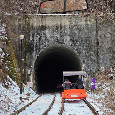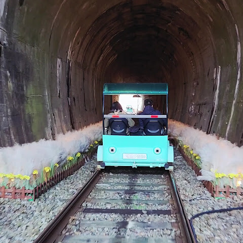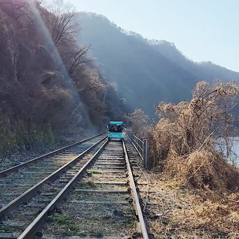 강촌 레일파크는 방문하기 좋은 매력적인 곳이며, 투어 가이드에 따르면 한국에서 가장 오래된 레일파크 중 하나입니다. 수십 년 동안 존재해 왔지만 2010년경 현재 위치로 이전되었습니다. 코스를 완주한 후에는 이전 위치에 있던 옛 건물들을 볼 수 있어 향수를 불러일으킵니다. 레일바이크는 2인 또는 4인 탑승이 가능하며, 브레이크는 오른쪽에 있습니다. 트랙의 많은 구간이 내리막길이라 페달을 너무 세게 밟을 필요가 없고, 자전거가 스스로 미끄러지듯 나아갑니다. 코스를 따라가다 보면 사방으로 아름다운 풍경이 펼쳐지고, 조명과 테마로 장식된 여러 터널을 지나게 됩니다.